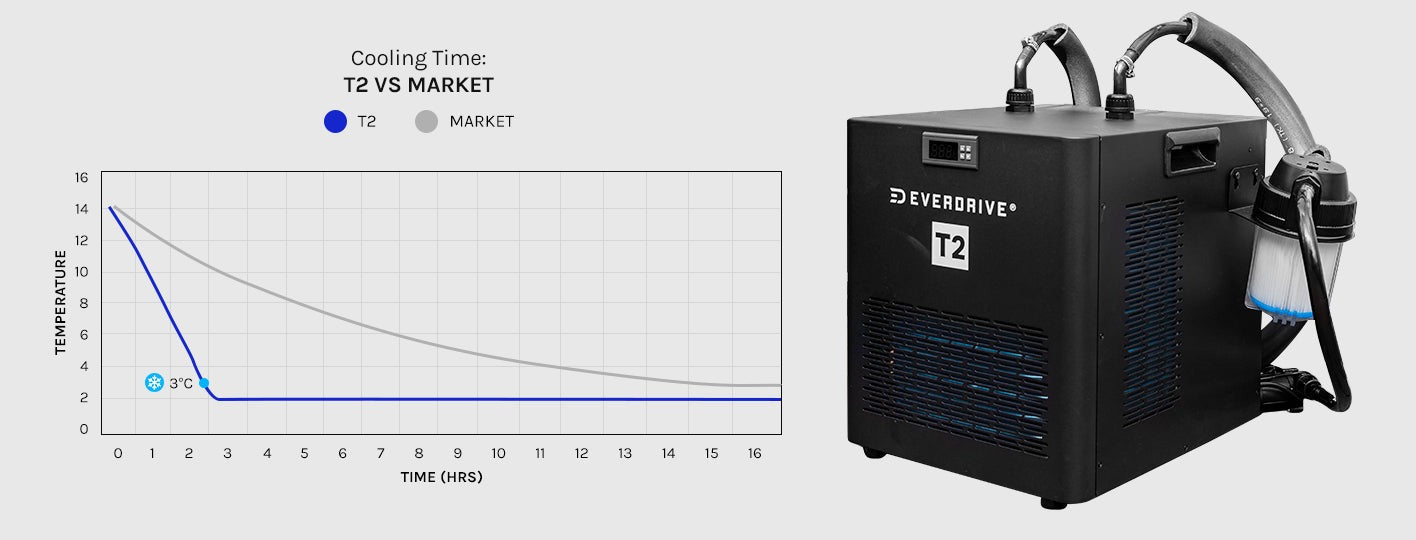 The T2 Chiller Unit has precise temperature controls from 2°C to 36°C using efficient cooling fans with insulated tubing for maximum energy-efficiency. A powerful 510w compressor gives it a cooling speed that is 5x faster than the T1. With an operational noise level of 50db (equivalent to the hum of a refrigerator), the T2 Chiller is perfect for home use. The included water filter keeps the water clean without interrupting its flow, while brass fittings on the connector tube make it more durable and longer lasting than plastic ones.