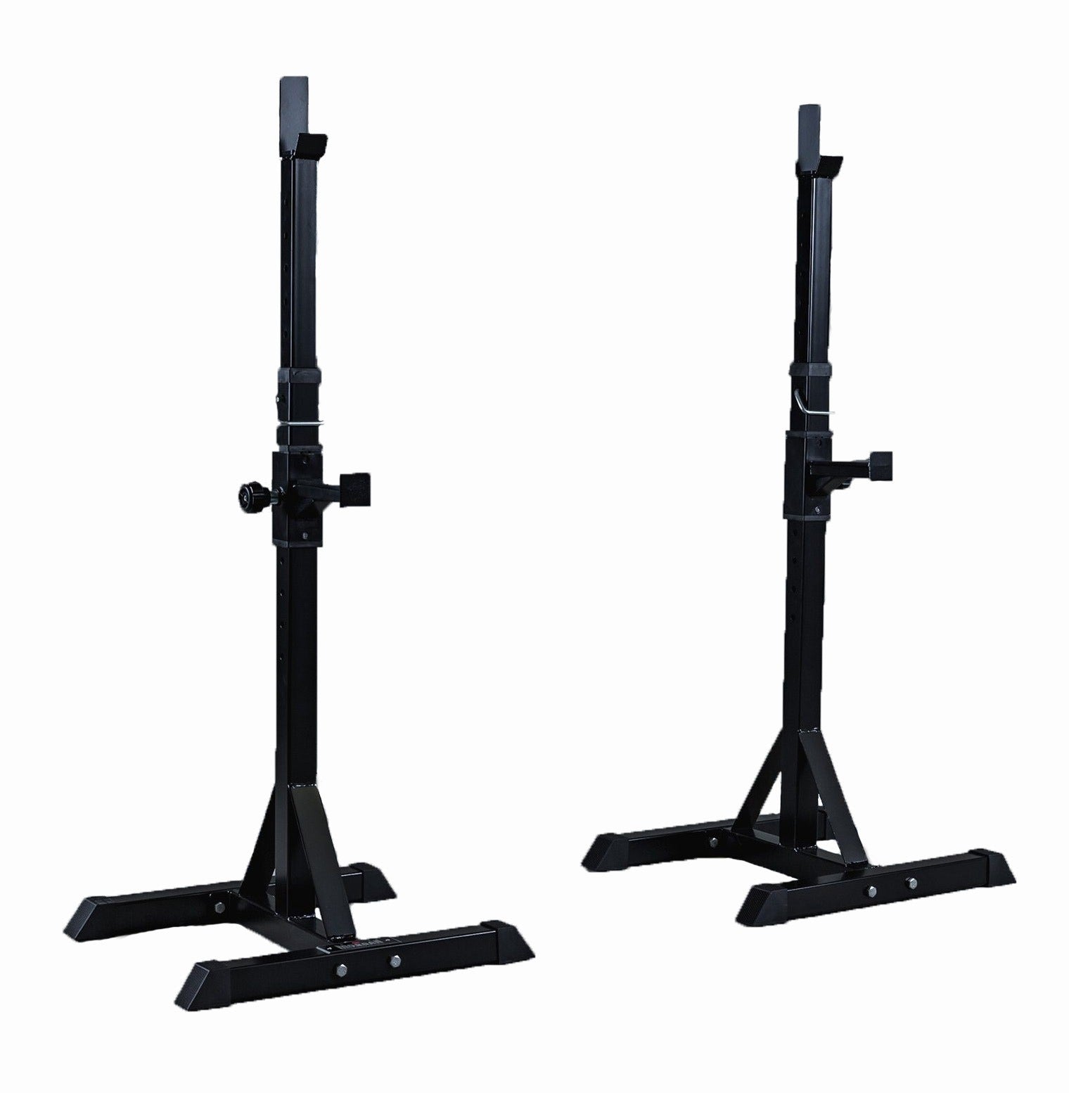 The uprights on a squat stand are called supports, rails, and pins. These should be made of a strong material like steel so it will support the weights you are using.