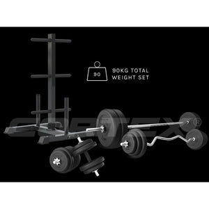 Achieve peak strength training with the CORTEX 90kg EnduraCast Barbell Weight Set. This all-inclusive home gym kit combines robust EnduraCast PVC-coated plates, three types of bars, and a sturdy weight tree.