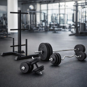 A weight tree is included for efficient organization and safe storage of all plates and bars.