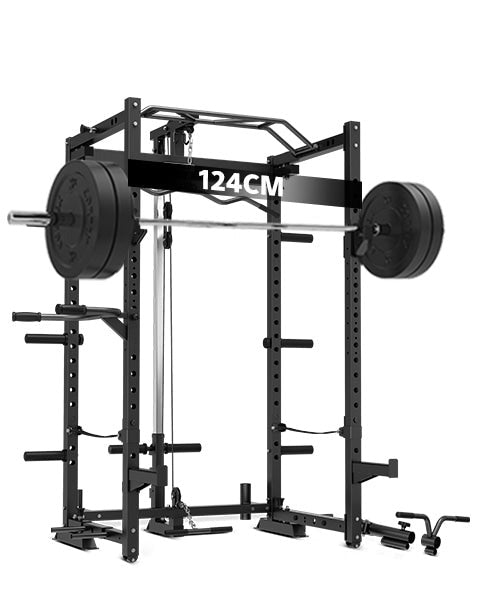 With a rack width of 124cm, this versatile structure accommodates most 6ft standard barbells and effortlessly fits all 7ft Olympic barbells, providing a universal solution for users with various equipment preferences. Additionally, the PR-4 features storage sleeves and loadable weight sleeves on the cable machine, designed to accept both 25mm Standard and 50mm Olympic weight plates.