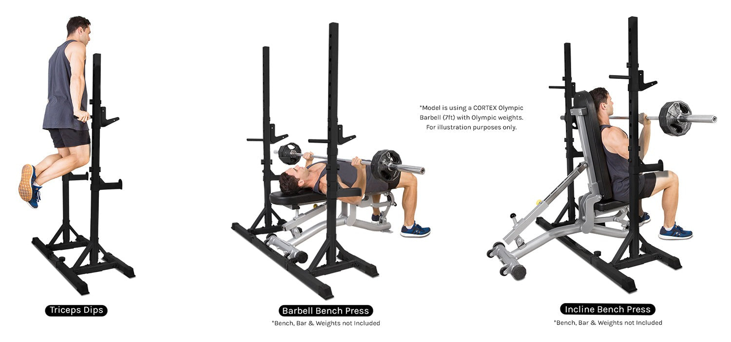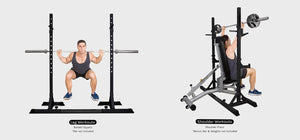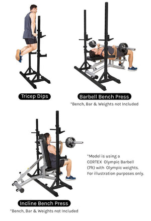 Conquer all of your compound lifts such as Bench Press (separate exercise bench required), Squats, Shoulder Press and more with our SR-10 Squat Stands.
