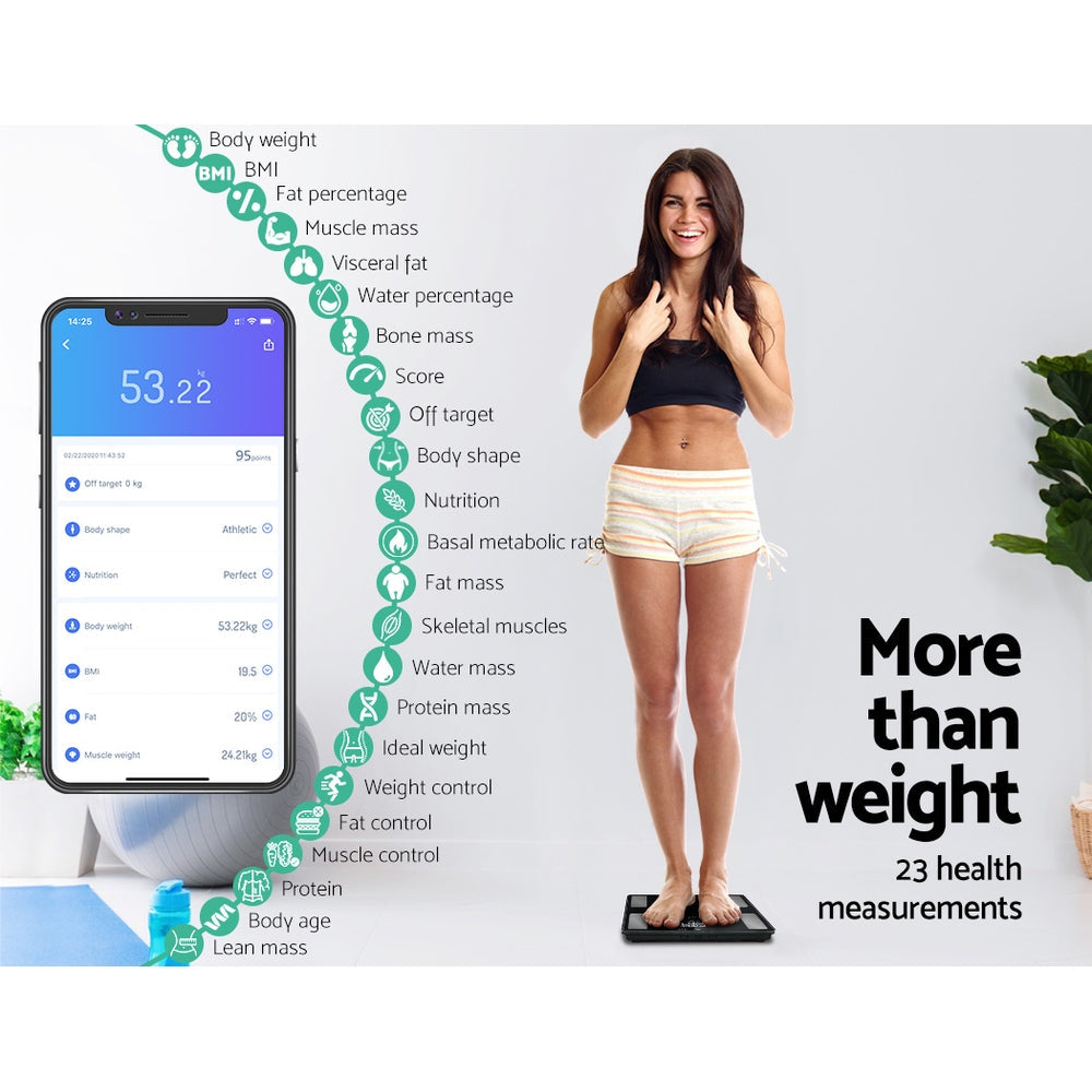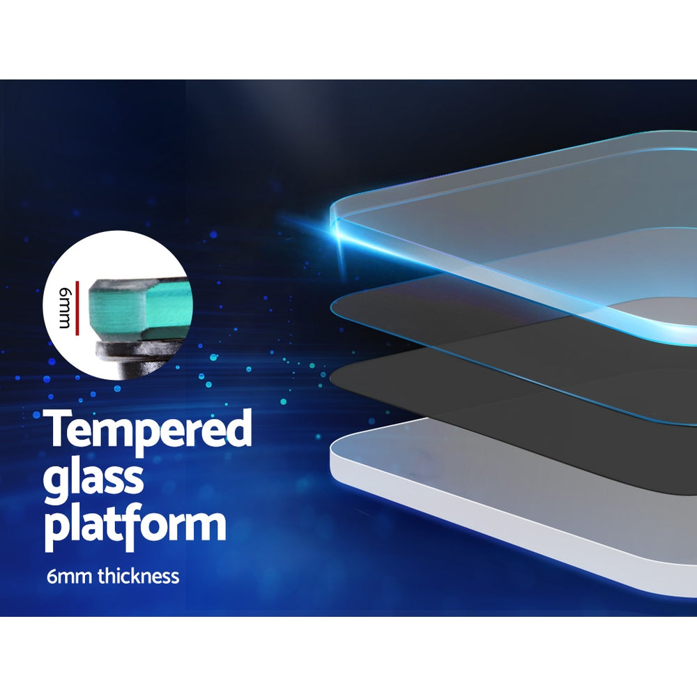 Kicking your fitness goals has just become easier with our Everfit Scale. Equipped with four high-precision sensors, the scale measures 23 unique parameters including weight, BMI, body fat ratio, lean mass, water percentage, muscle mass, bone mass and more, so you can see a complete picture of your health. The scale shows measurements in three units (kg, lb and st-lb) with a weight capacity of 180kg, 400lbs or 28st. The scale has a durable 6mm thick tempered glass platform, and the entire super slim ensemble is only 20mm thick for easy storage and maintenance. To use the scale, just download the Scale Up app onto any iOS or Android phone, open the app and pair the scale to your phone using Bluetooth. The scale will display the results on the large LCD display after each weigh-in and you can store data for up to 99 users. With other great features such as baby scale mode, low power/overload indication and auto on/off, our scale makes keeping track of your health fast and easy.