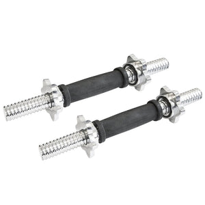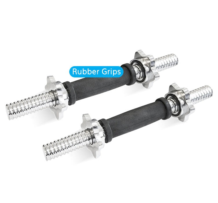 These dumbbell handles are ideal for strength training, feature a rubber grip handle, spiral lock collars (Star shaped) and a strong chrome finish for durability.