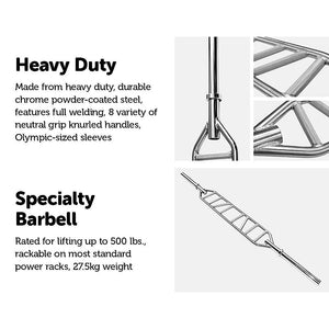 Among the many applications of this specialty barbell are the bench press, floor press, lockouts, JM press, and shoulder press.
