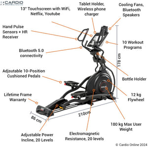 This upgraded model boasts a large 13.3-inch touchscreen display with full WIFI connectivity and screen mirroring capabilities. With 20 levels of power incline and a unique adjustable pedal system, the E95 allows for precise targeting of major lower body muscle groups.
